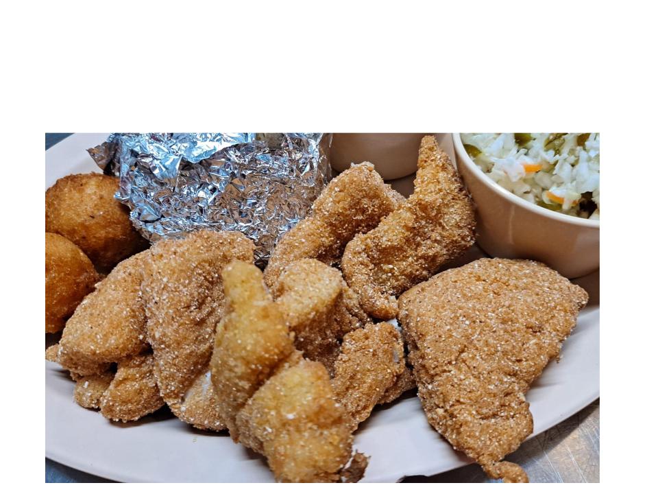 4 pieces (approximately 9 ounces) of Supreme Cut Southern Fried Catfish. Includes crinkle cut fries tossed in Dawson's All Purpose Seasoning, and 1 hush puppy.