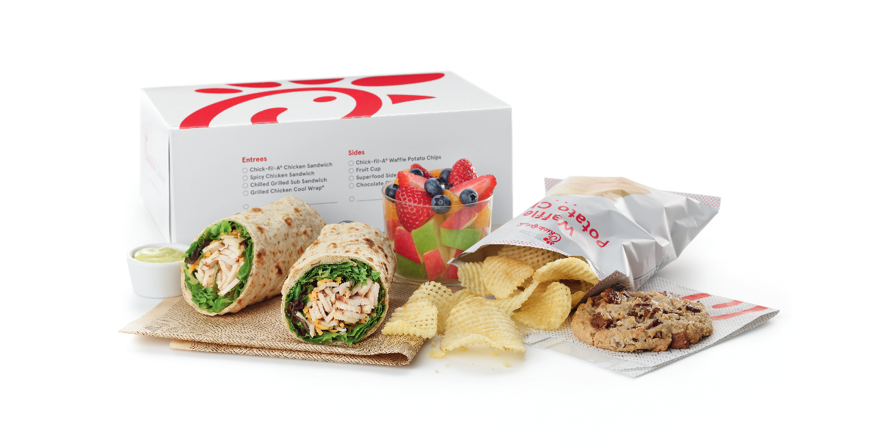 Chick-fil-A Cool Wrap ® a Bag of Waffle Potato Chips and a Chocolate Chunk Cookie. DRINK NOT INCLUDED, NO Special additions or subtractions